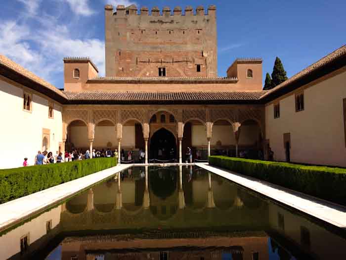 Anyway, the Alhambra was very beautiful and the intricate carvings and colours in the rooms were breath-taking. The palace was only slightly marred by four hot and tired children who kept on complaining how boring it was…oh, those were ours and the kids of our friends, so we unfortunately couldn’t roll our eyes and tut-tut in our friends’ general direction while looking smugly at our own children, as none of the kids were studying the wall-carvings and commenting on the history behind the building as they should have been. They made it up to us later at dinnertime when they disappeared off into an orange tree-ringed square we were tapa-ing at (I think I should make a new verb!) and left us to drink cañas and eat like pigs while they played football with some locals. 🙂